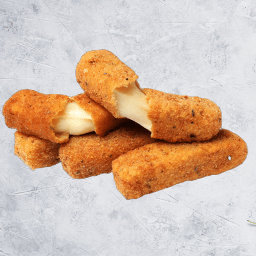 4 stuks. Knapperige gefrituurde mozzarella sticks gevuld met zachte mozzarellakaas